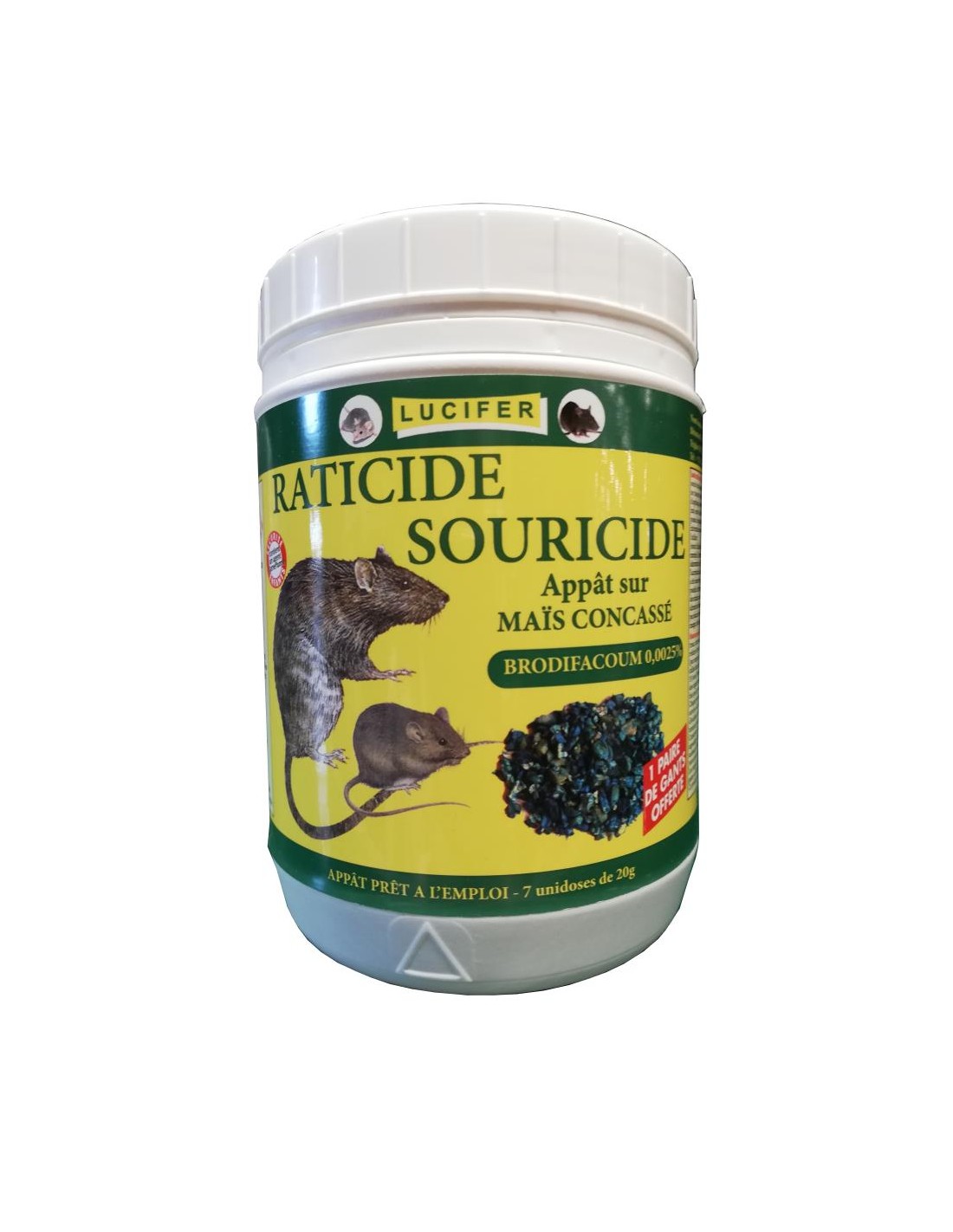 Poids : 140 g. 7 unidoses de 20 g. Composition : Brodifacoum : 0,025 g. Agent amérisant : 0,01 g. Céréale rodonticide. 1 paire de gants offerte.