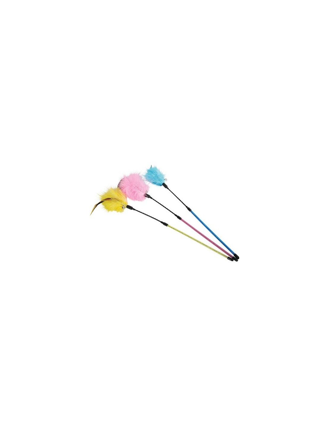Ce jouet pour chat est une canne à pêche plumes avec embout flexible, avec une longue manche scintillante avec grelots.