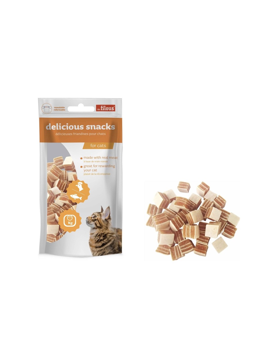 Composition : viande de poulet 71%, cabillaud 20%, amidon de tapioca. Additifs : glycérine végétale, sorbital