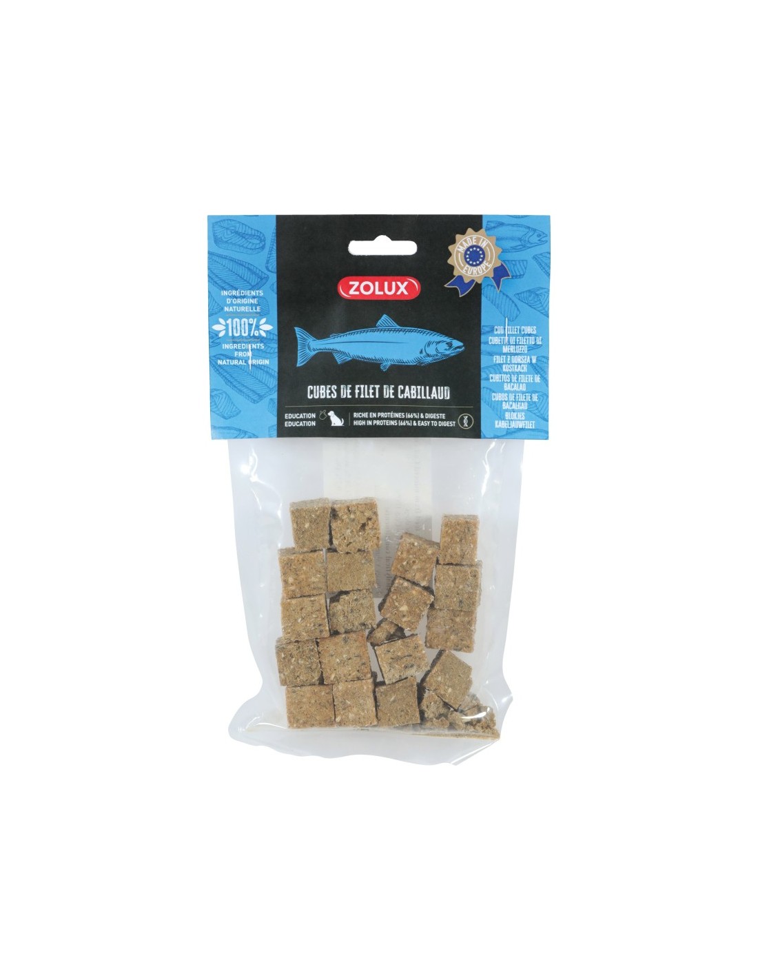 Cubes de filet de cabillaud pour chien, est un délicieux en-cas qui saura satisfaire votre compagnon, amoureux du poisson.
