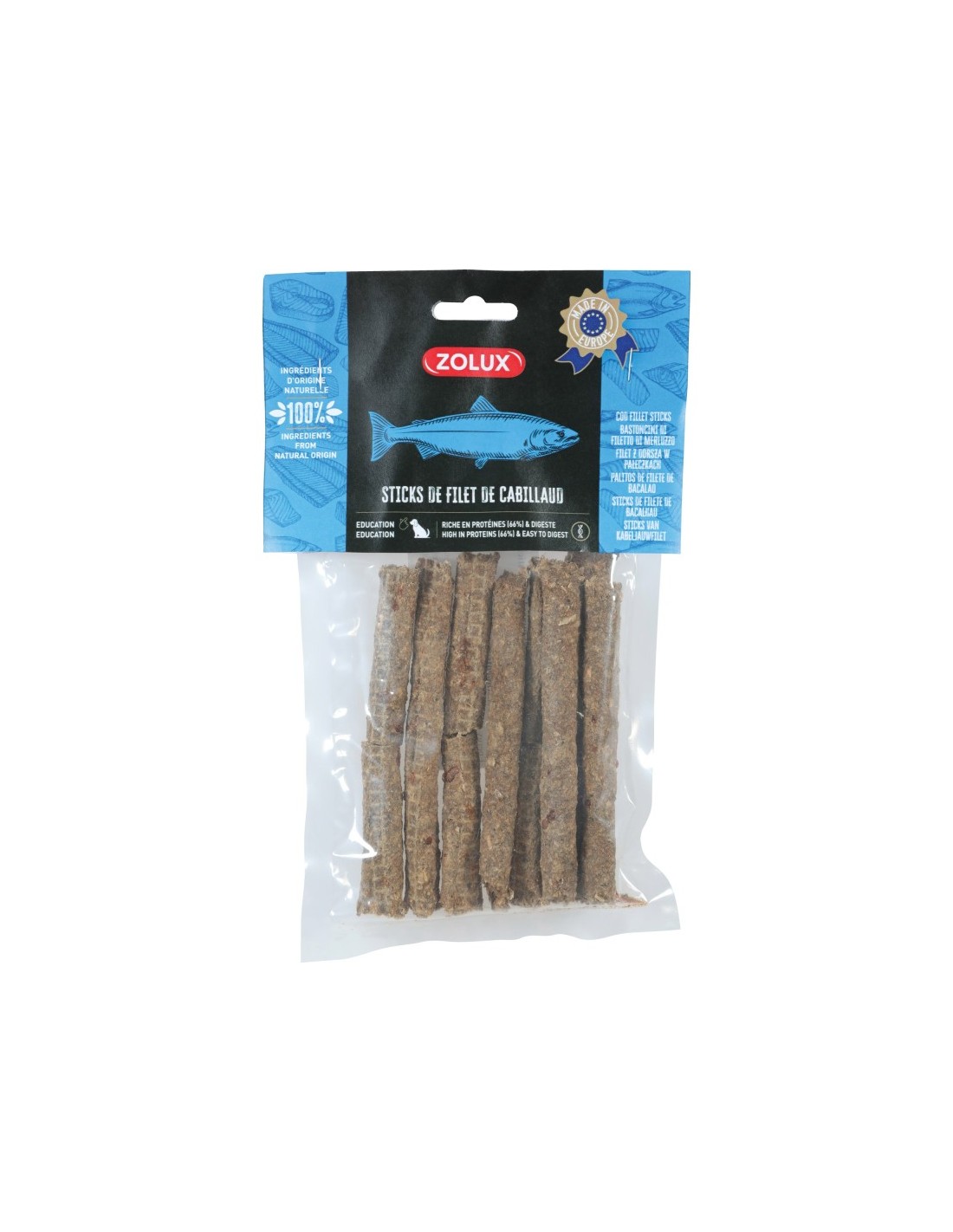 Le produit Sticks de filet de cabillaud pour chien est une friandise produite à la main, contenant 100% d'ingrédients d'origine naturelle.