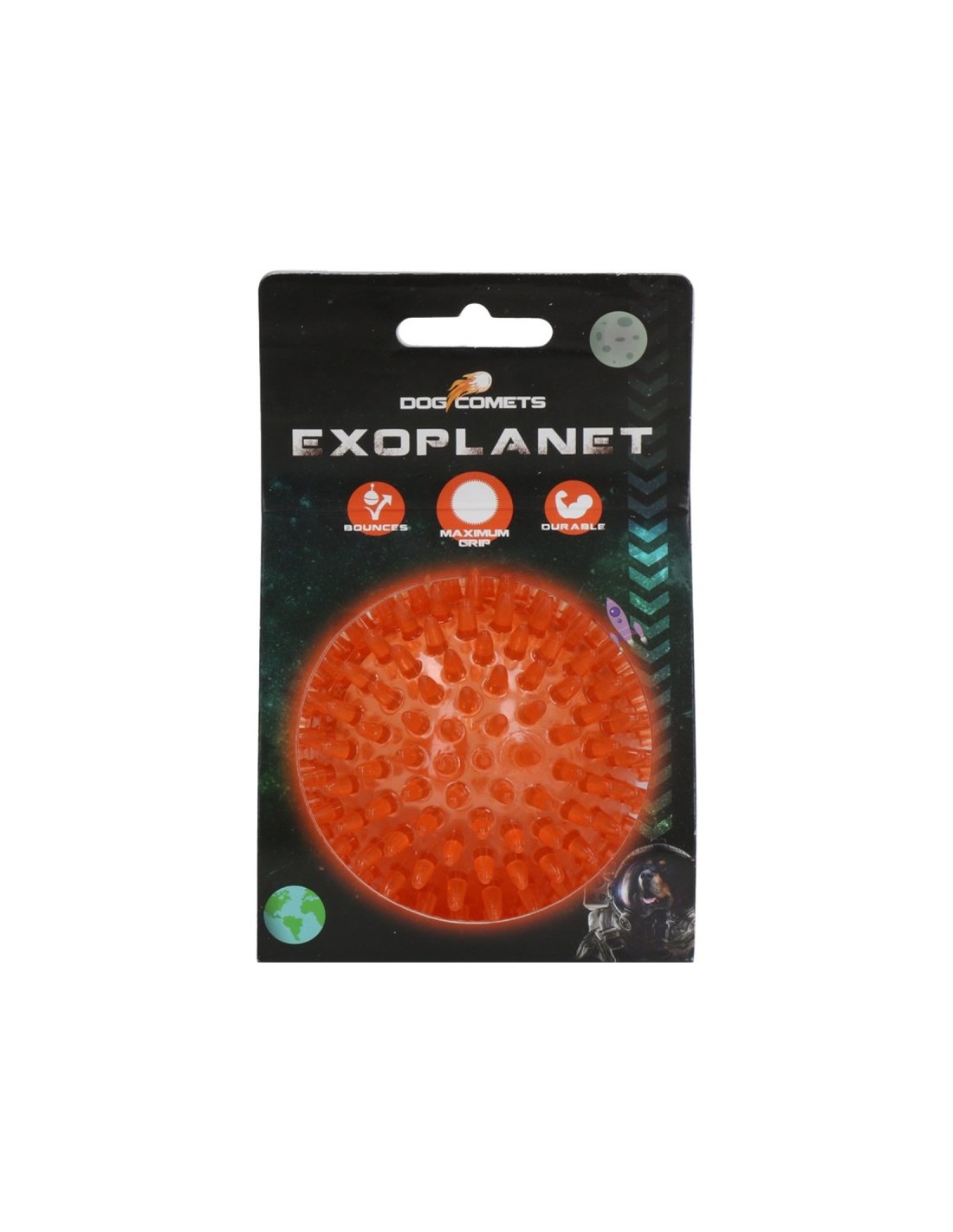 Cette balle pleine d'épines robustes mais flexibles offre des heures de plaisir et aide à nettoyer les dents en même temps ! Le Dog Comets Exoplanet rebondit parfaitement, flotte sur l'eau et est facile à saisir grâce aux épines. Ces propriétés rendent le ballon très adapté à la récupération et au jeu dans l'eau. Lorsque le chien saisit la balle dans sa gueule, les épines massent les gencives et aident à nettoyer les dents.
