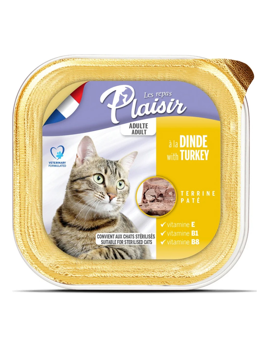 Les recettes de pâté Les Repas Plaisir à la Dinde pour chat adulte ont un taux élevé de protéine et un faible taux de matières grasses. Et elles sont supplémentées en DL méthionine, qui favorise l'acidification des urines. Elles conviennent ainsi idéalement aux chats stérilisés.