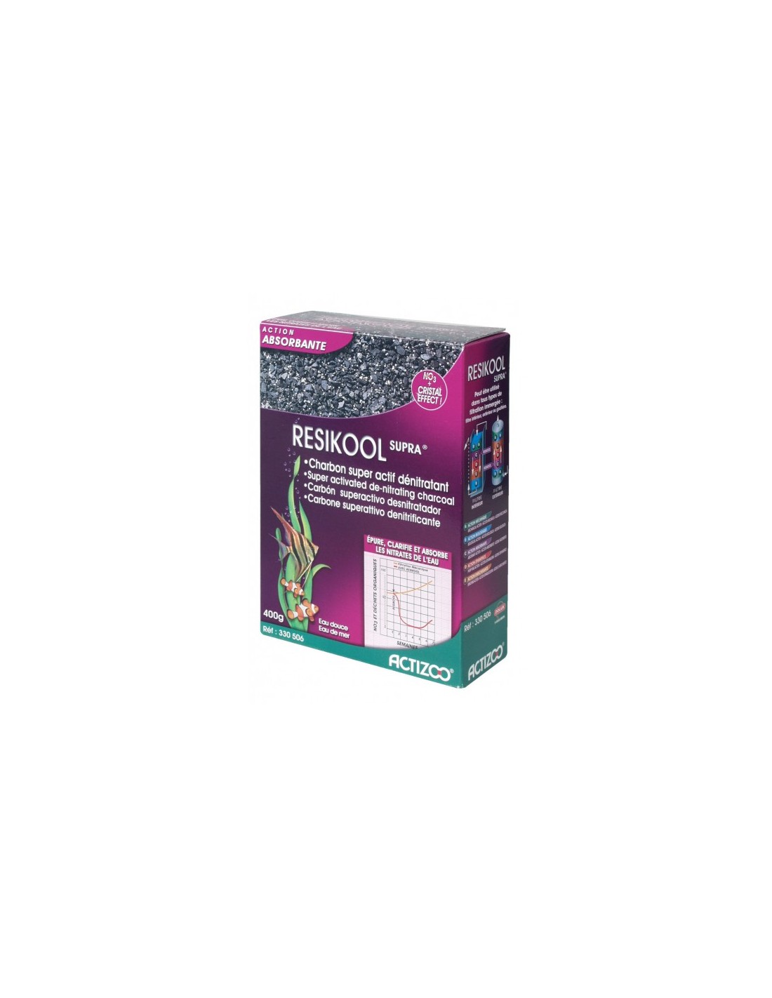 ResiKool Supar est une association de charbon et de résines qui épure, clarifie et absorbe les nitrates de l'eau. Avec "Cristal Effect" ! Pour eau douce et eau de mer.