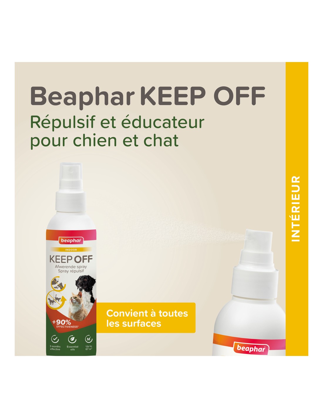 Créez un foyer confortable pour vous et votre animal grâce au Spray répulsif d’intérieur KEEP OFF de Beaphar. L’odeur du spray aide à repousser et à éduque les chiens et les chats afin qu’ils évitent les zones traitées. Ce spray aide aussi à repousser les fouines. Notre Spray KEEP OFF aide à éviter les marquages urinaires, les griffades et la destruction des meubles, des tapis et autres objets dans votre intérieur. Les recherches montrent que 97 % des chiens et 90 % des chats évitent efficacement les zones traitées* avec le Spray KEEP OFF, offrant jusqu’à 3 mois de protection.