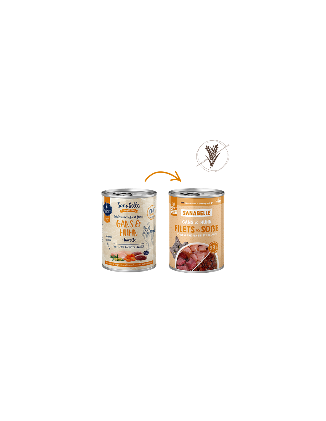 47 % de poulet frais, 27 % de bouillon de poulet, 9 % de poumons frais, 5 % d'oie fraîche, 4 % de carottes, 3 % de cœurs frais, 3 % de foies frais, 1 % de minéraux, 1 % d'huile d'olive pressée à froid.