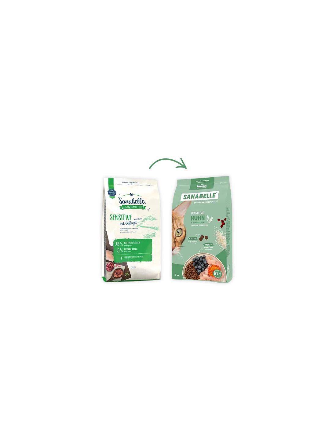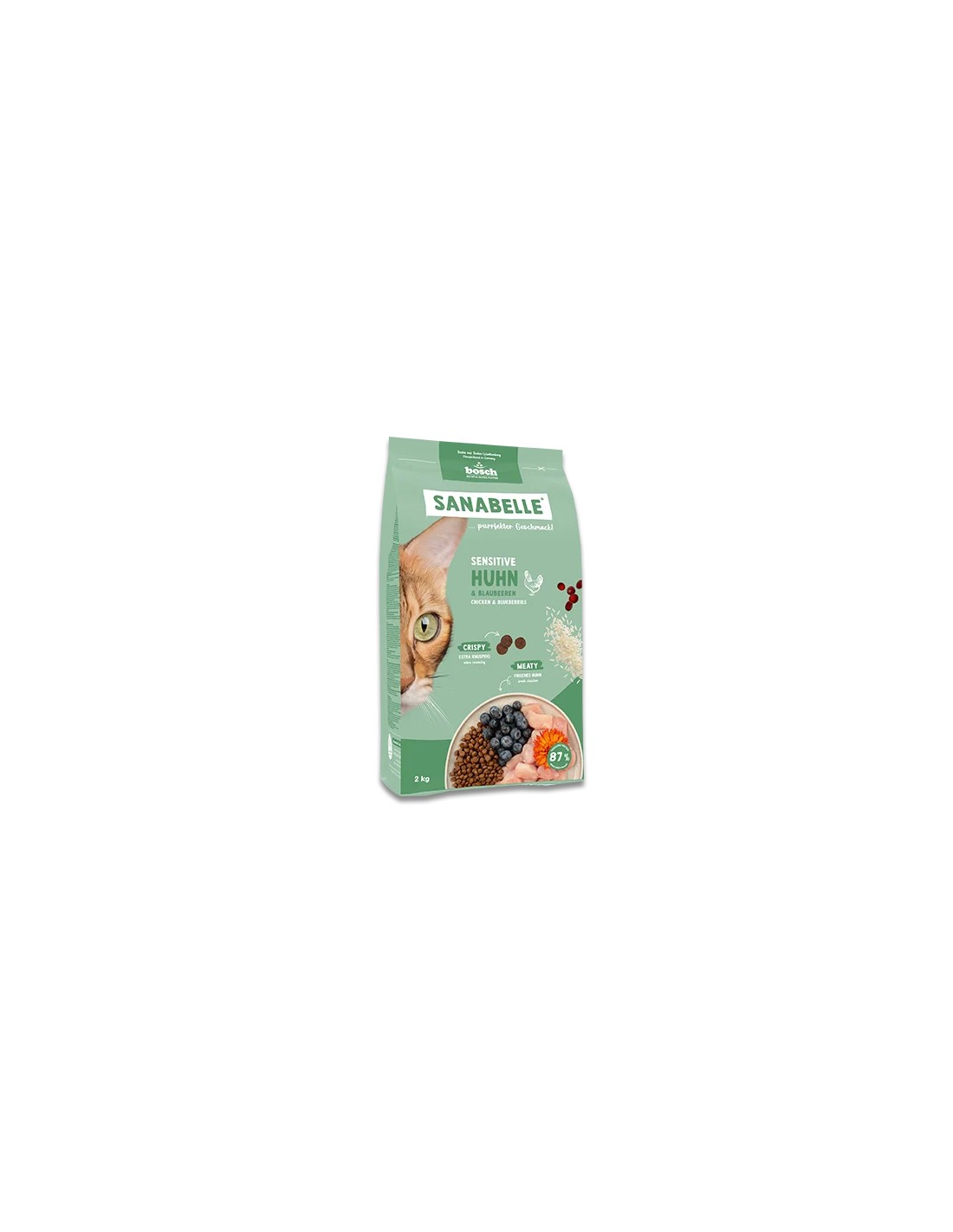 Viande de poulet fraîche (25%), maïs, protéines de volaille (séchées), graisse animale, grattons (séchés), riz (4%), hydrolysat de protéines, farine de riz, protéines de maïs, fibres de pois, farine de poisson, farine de foie, carbonate de calcium, huile de saumon (0,5%), chlorure de potassium, canneberges (séchées, 0,1%), myrtilles (séchées, 0,1%), persil (séché, 0,1%), levure (séchée, 0,1%), fleurs de souci (séchées, 0,05%).
