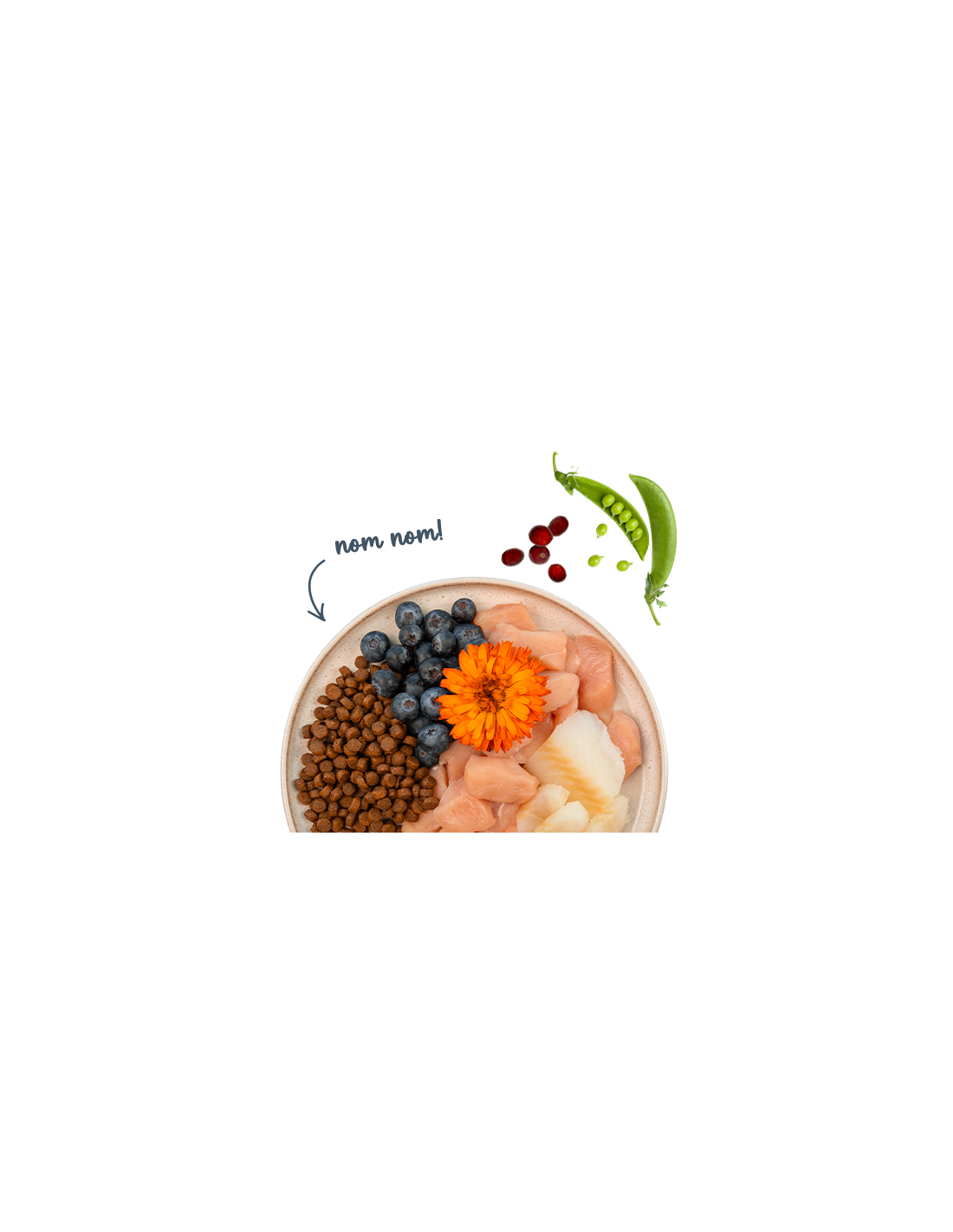 Viande de poulet fraîche (20 %), orge, maïs, protéines de volaille (séchées), protéines de maïs, graisse animale, truite fraîche (5 %), hydrolysat de protéines, graines de lin, carbonate de calcium, riz, farine de foie, huile de saumon (0,5 %), pois (séchés, 0,4 %), chlorure de potassium, airelles (séchées, 0,1 %), myrtilles (séchées, 0,1 %), persil séché (0,1 %), levure (séchée, 0,1 %), fleurs de souci (séchées, 0,05 %).