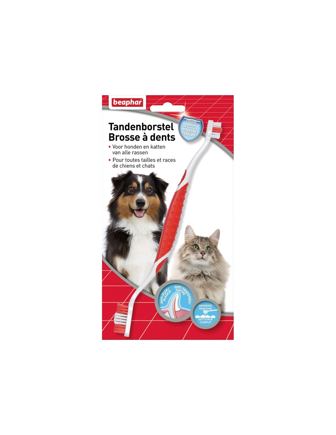 La brosse à dents de Beaphar permet un nettoyage complet et précis de la dentition de votre animal. Il est important de brosser régulièrement ses dents afin d’éliminer la plaque dentaire et de limiter la mauvaise haleine. La brosse à dents de Beaphar dispose de deux têtes et convient à toutes les tailles et races de chiens et de chats. Pratique et confortable, elle dispose d’un manche antidérapant. Les poils de la brosse ne sont pas de la même taille afin de nettoyer les dents des deux côtés et ainsi assurer un nettoyage en profondeur. Les poils sont doux et flexibles afin de ne pas abîmer les gencives.