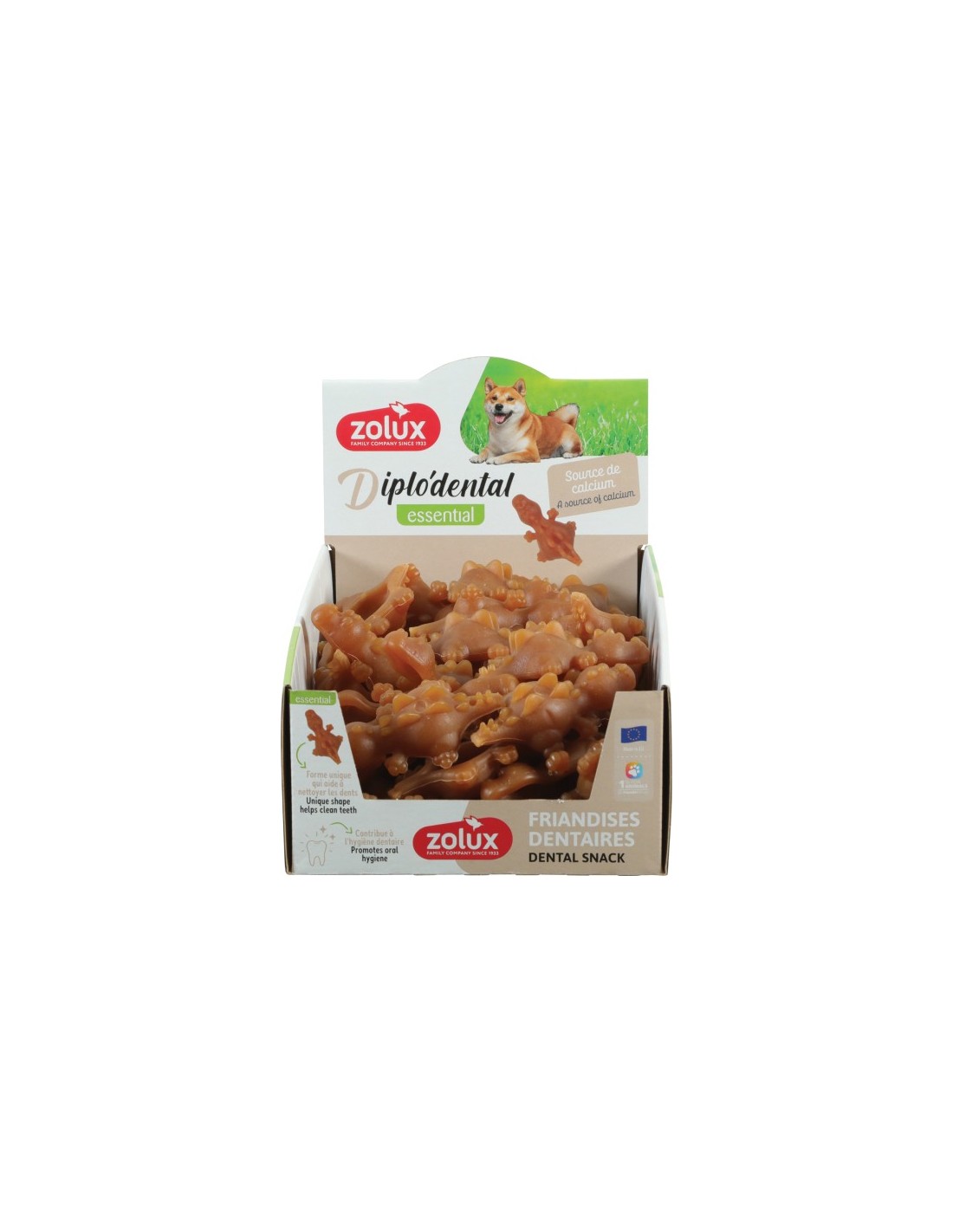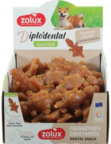 Le Diplo'dental est une friandise dentaire ludique et efficace, spécialement conçue pour allier plaisir de mastication et entretien de la santé bucco-dentaire chez le chien. En forme de petits dinosaures, ces friandises solides invitent au jeu tout en contribuant au nettoyage des dents.