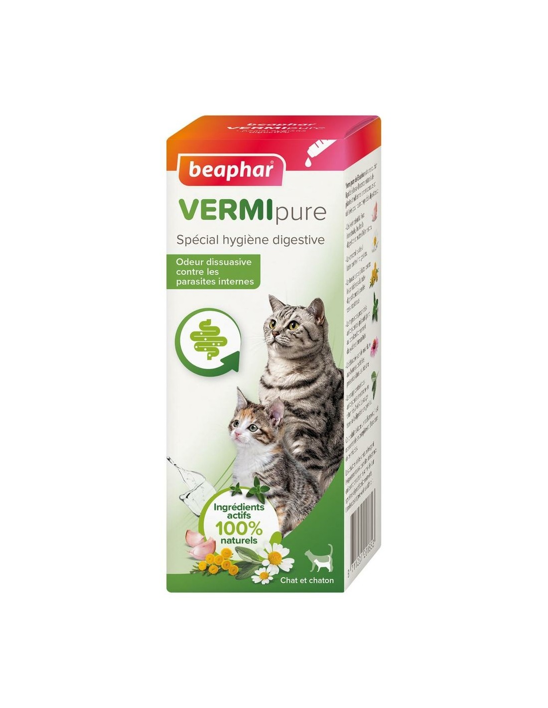 VERMIpure de Beaphar est une solution liquide à base d’extraits naturels de plantes traditionnellement connues et utilisées pour leurs propriétés digestives : ✓ L’ail permet d'entretenir la flore intestinale, de faciliter la digestion et de stimuler l'élimination. ✓ La camomille est reconnue pour lutter contre l’indigestion. ✓ La tanaisie est utile pour faire face aux problèmes du tube digestif que peuvent causer les vers intestinaux. ✓ Le thym contribue au bon fonctionnement du système immunitaire grâce à ses propriétés antioxydantes. ✓ L’échinacée alimente les bonnes bactéries présentes dans les intestins. ✓ La sauge est riche en vitamines A et K et en antioxydants, et favorise la bonne digestion. Ce produit n’est pas un médicament, il est recommandé en complément d’une cure de vermicides. Les chatons et les chats hébergent fréquemment des parasites intestinaux qui compromettent la santé de leur système digestif (ballonnements, flatulences) et peuvent les affaiblir.